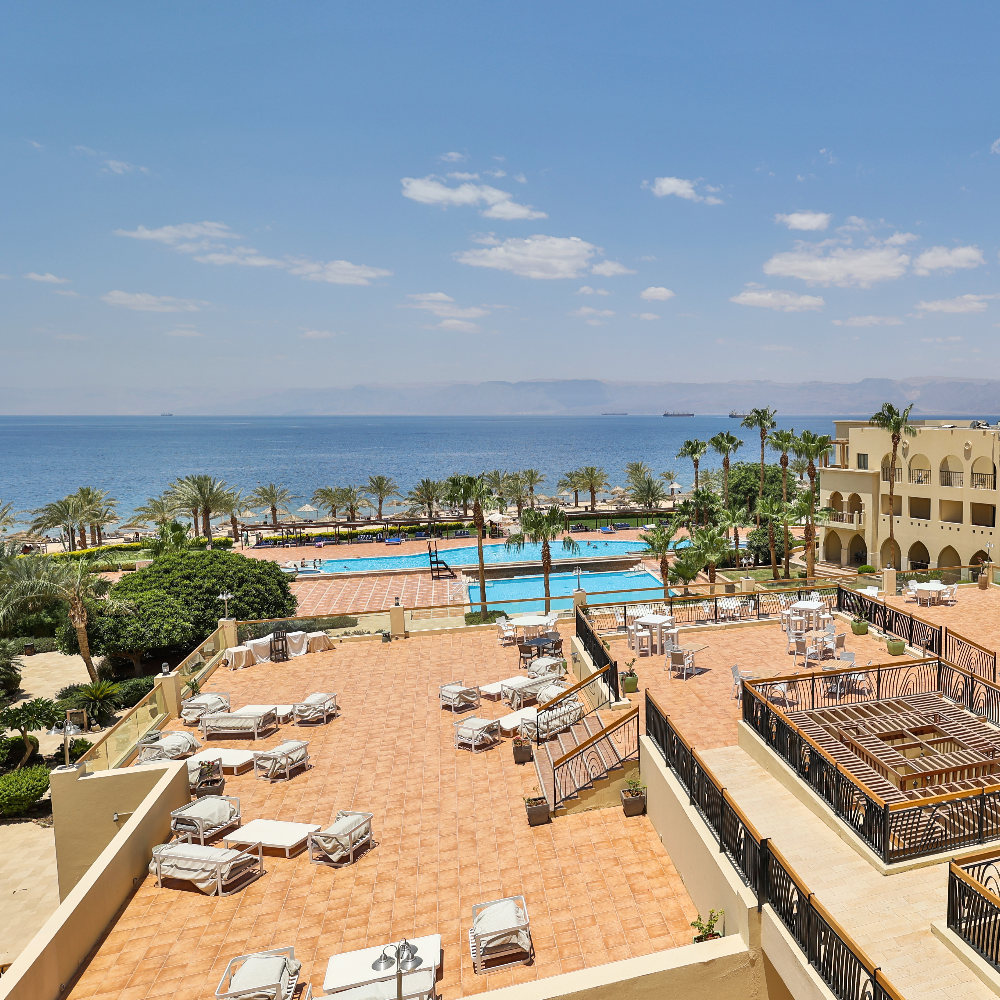 Situated just outside the lobby, our terrace opens its doors from 7:00 pm to 12:00 pm during the summer. It's the exclusive spot in Aqaba where you can witness the mesmerizing play of sunlight on the shores and the vibrant scenery of Grand Tala Bay Resort. Indulge in our grill-style menu and shisha offerings while immersing yourself in this picturesque setting.