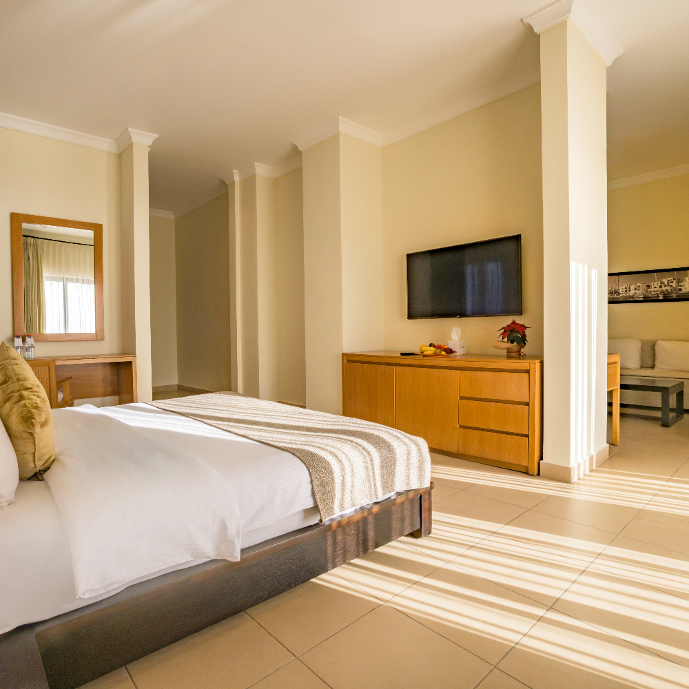 Indulge yourself most luxurious suites of Grand Tala Bay at one of our Executive Suites, this suite is located on the top floor of the hotel’s main building, and include a private large terrace with a view of the Red Sea and resort’s pools. The suite also features separate living area with a 50-Inch HDTV ( 65 Sqm , Capacity 2 )